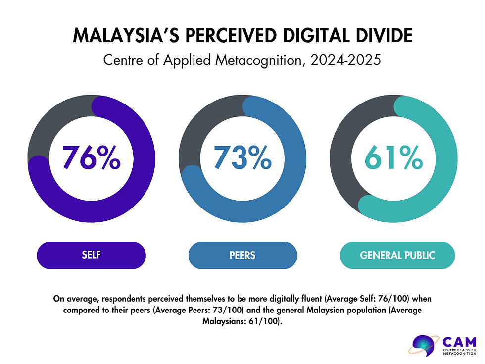 To explore this question, the Centre of Applied Metacognition (CAM) conducted a survey with 133 Malaysian working professionals, most of whom work in higher education. The survey asked participants to rate themselves, their peers, and the general public on three areas: digital fluency, familiarity with AI and confidence in learning new technologies. Participants also completed a Digital and AI Fluency (DnA) Quiz - a comprehensive assessment that measures an individual's competency and confidence in mastering key digital and AI skills.